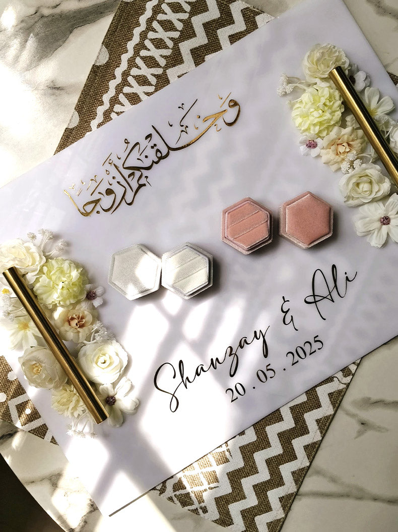 Celebrate your forever moment in timeless style with our handcrafted reactangular ring tray designed for Nikkah, engagement, or wedding day ceremonies. This elegant keepsake is perfect for presenting wedding rings with grace and meaning.