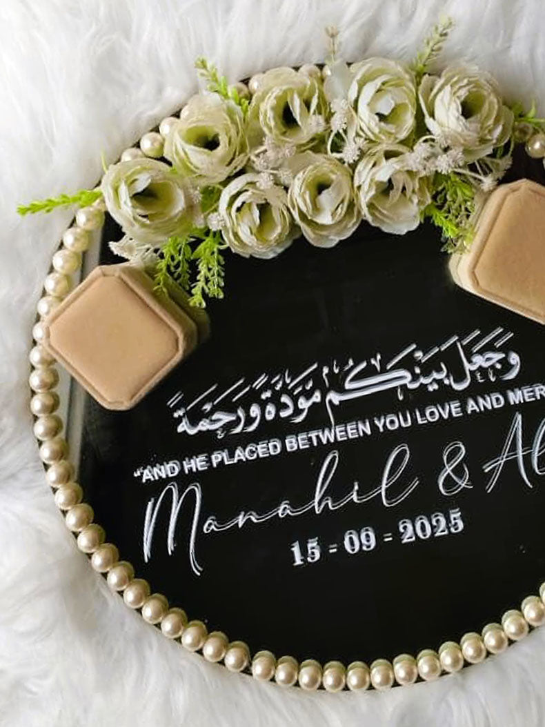Celebrate your forever moment in timeless style with our handcrafted circular ring tray designed for Nikkah, engagement, or wedding day ceremonies. This elegant keepsake is perfect for presenting wedding rings with grace and meaning.