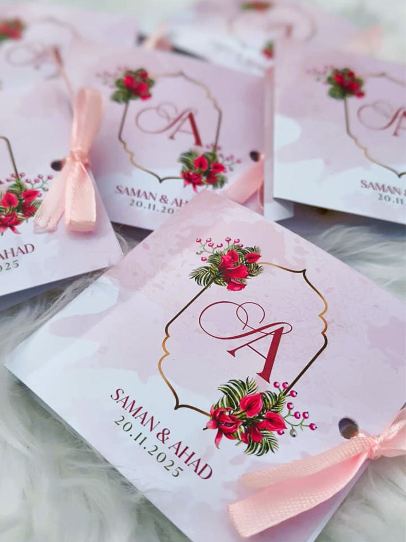 A charming keepsake with a sweet surprise inside! This beautifully designed favor card features personalized initials, delicate floral artwork, and a soft ribbon detail — opening to reveal a premium heart-shaped chocolate.